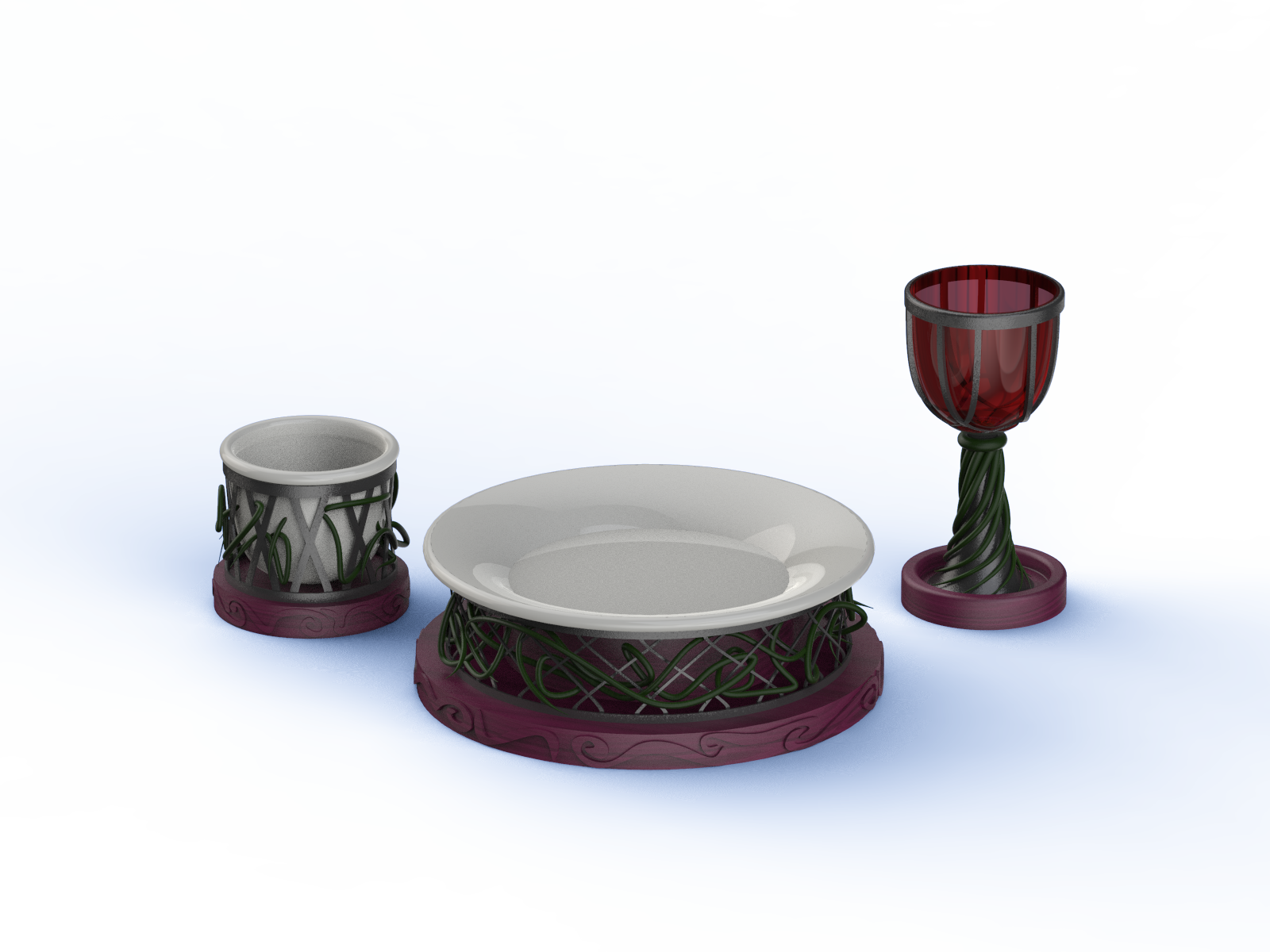 A themed dish set meant to represent aspects of a strong but overgrown castle. With winding vines across a iron lattice juxtaposing the clean white dishes and elegant filigrees, this dish set represents that balance between beauty and chaos.